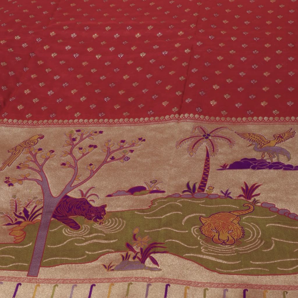 Elegant silk fabric featuring delicate Banarasi butti work paired with a rich Paithani daman, creating a beautiful fusion of classic weaves and regal detailing. Luxurious in texture with a graceful drape, it is ideal for premium sarees and refined festive ensembles.