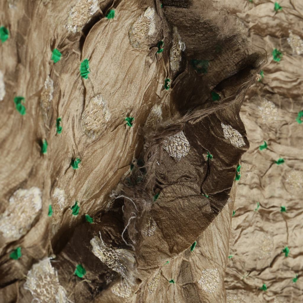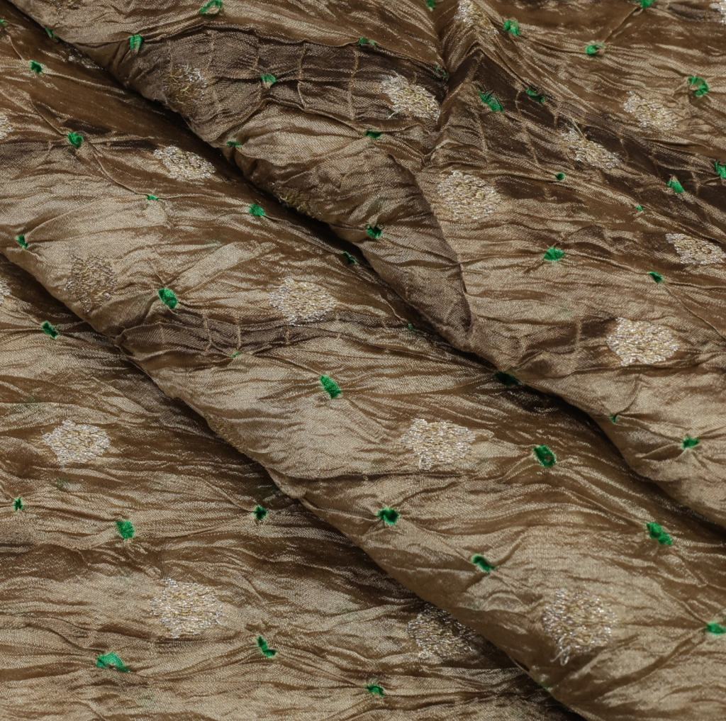 Chiniya silk bandhej with shibori and handwoven golden Banarasi butti fabric is a unique and luxurious textile. It combines the elegance of Chiniya silk, a lightweight and lustrous fabric known for its smooth texture, with the artistry of bandhej, a tie-dye technique that creates vibrant patterns. The fabric is further enhanced with shibori, a traditional Japanese dyeing technique that involves creating intricate patterns by folding, twisting, or binding the fabric before dyeing. This adds depth and dimension to the design, making each piece truly unique. To add a touch of opulence, the fabric features handwoven golden Banarasi butti, which are small ornamental motifs typically woven with metallic threads. These golden butti add a regal and glamorous touch to the fabric, elevating its overall appeal. In summary, Chiniya silk bandhej with shibori and handwoven golden Banarasi butti fabric is a stunning blend of rich textures, vibrant colors, and exquisite craftsmanship, making it a perfect choice for special occasions or statement pieces.
