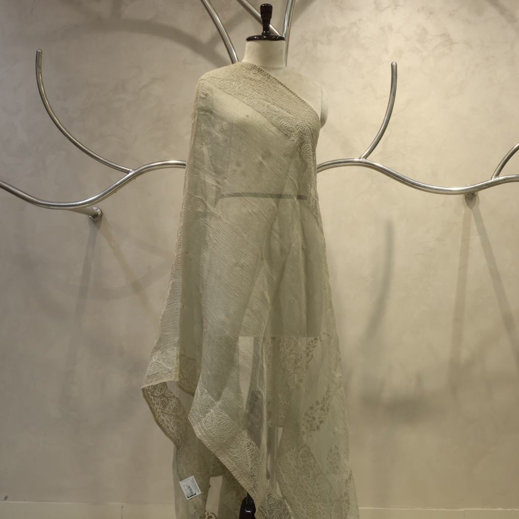 Elegant Crush Tissue Dupatta adorned with delicate embroidery work, offering a subtle shimmer and refined texture—perfect for festive and special occasion styling.