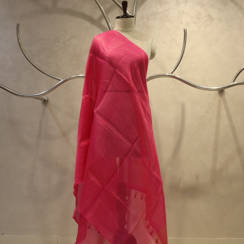 Pure Katan Silk Dupatta adorned with elegant golden zari stripes, offering a rich sheen and timeless Banarasi charm. Perfect to elevate festive and traditional ensembles with subtle luxury.