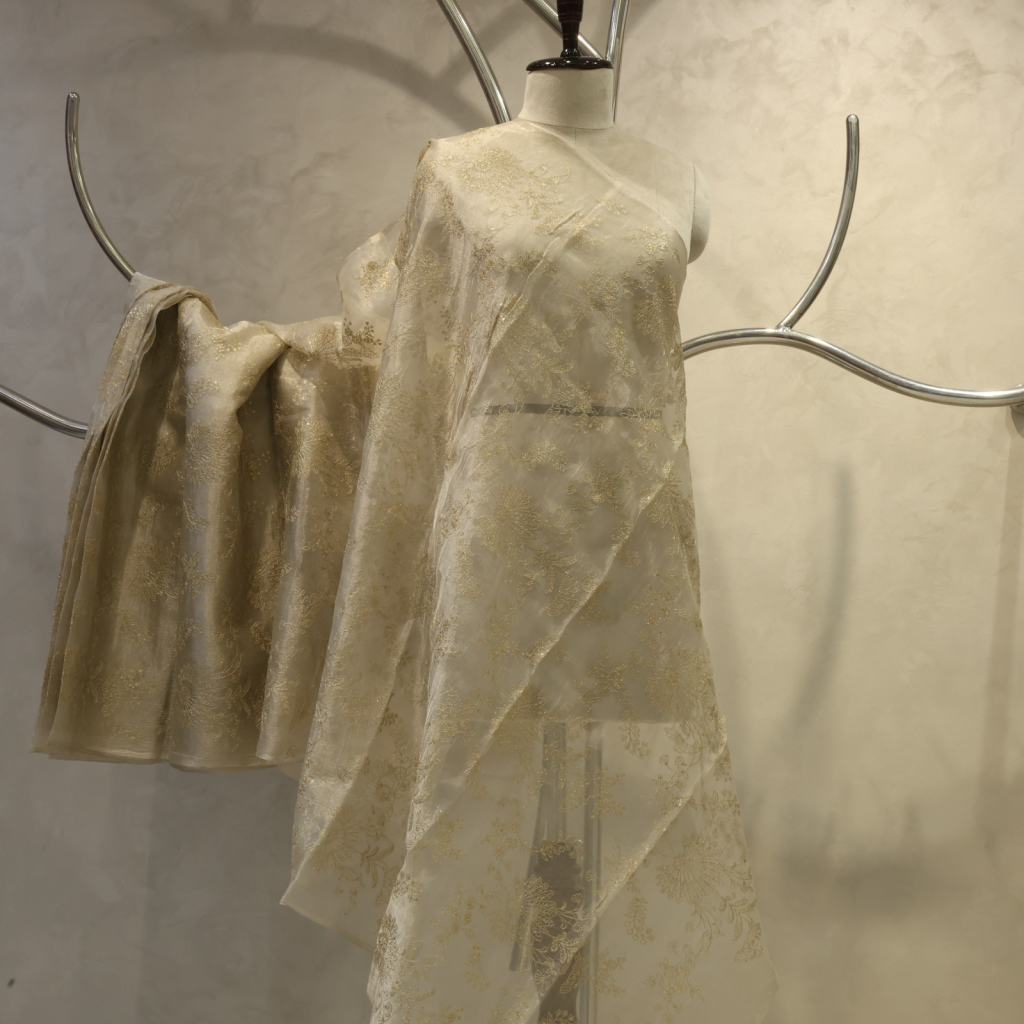 Premium Kora Silk Fabric featuring exquisite jaal embroidery work, offering a graceful texture and refined elegance ideal for festive and occasion wear creations.