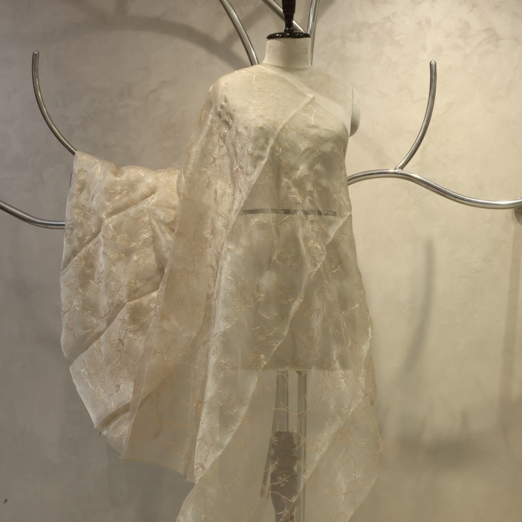 Premium Kora Silk Fabric featuring exquisite jaal embroidery work, offering a graceful texture and refined elegance ideal for festive and occasion wear creations.
