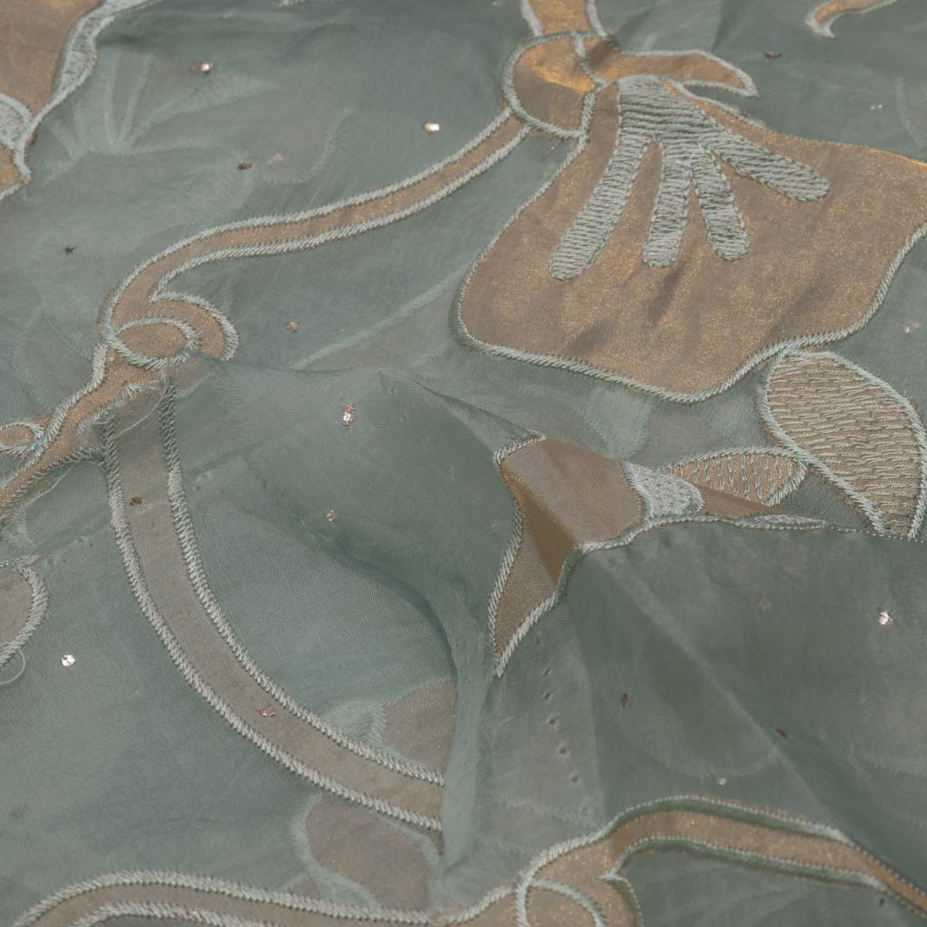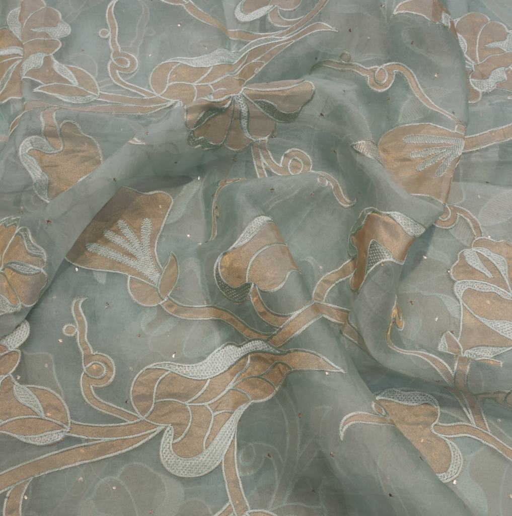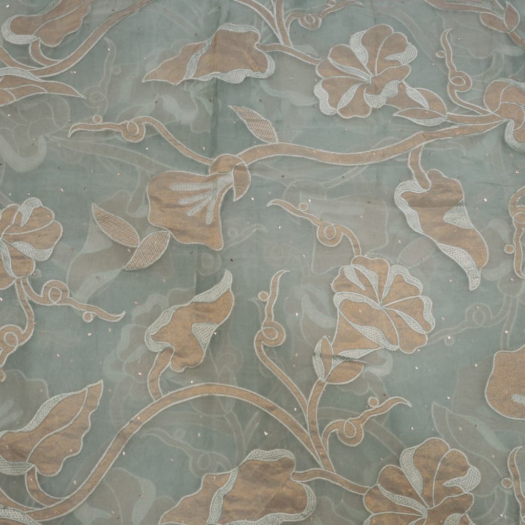 Delicately crafted organza adorned with intricate appliqué detailing and hand-done mukesh work, creating a subtle shimmer and rich texture. Lightweight and graceful, this fabric is perfect for festive wear, designer outfits, and elegant occasion ensembles.