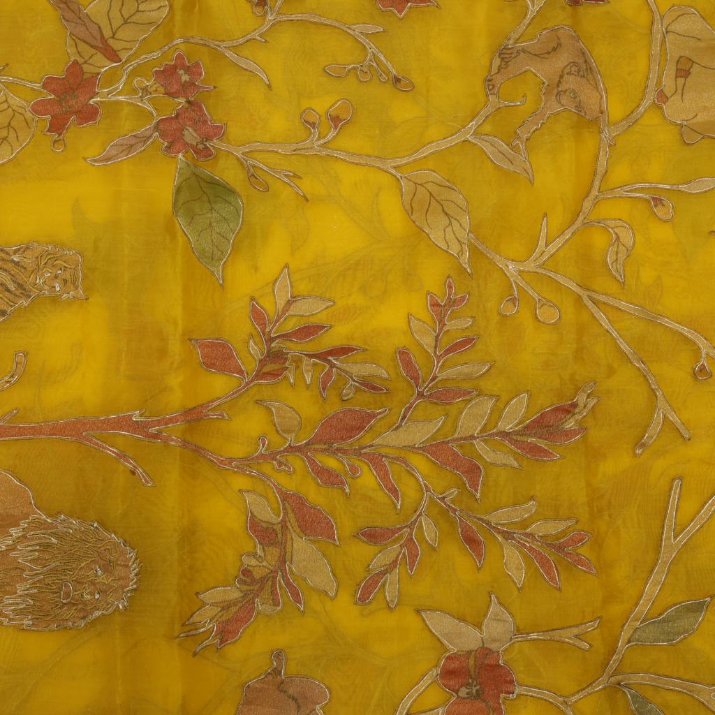 Luxurious organza silk fabric featuring elegant appliqué motifs, beautifully highlighted with a fine golden embroidered outline. Lightweight, sheer, and graceful, it adds a refined festive charm ideal for statement sarees, lehengas, and designer ensembles.