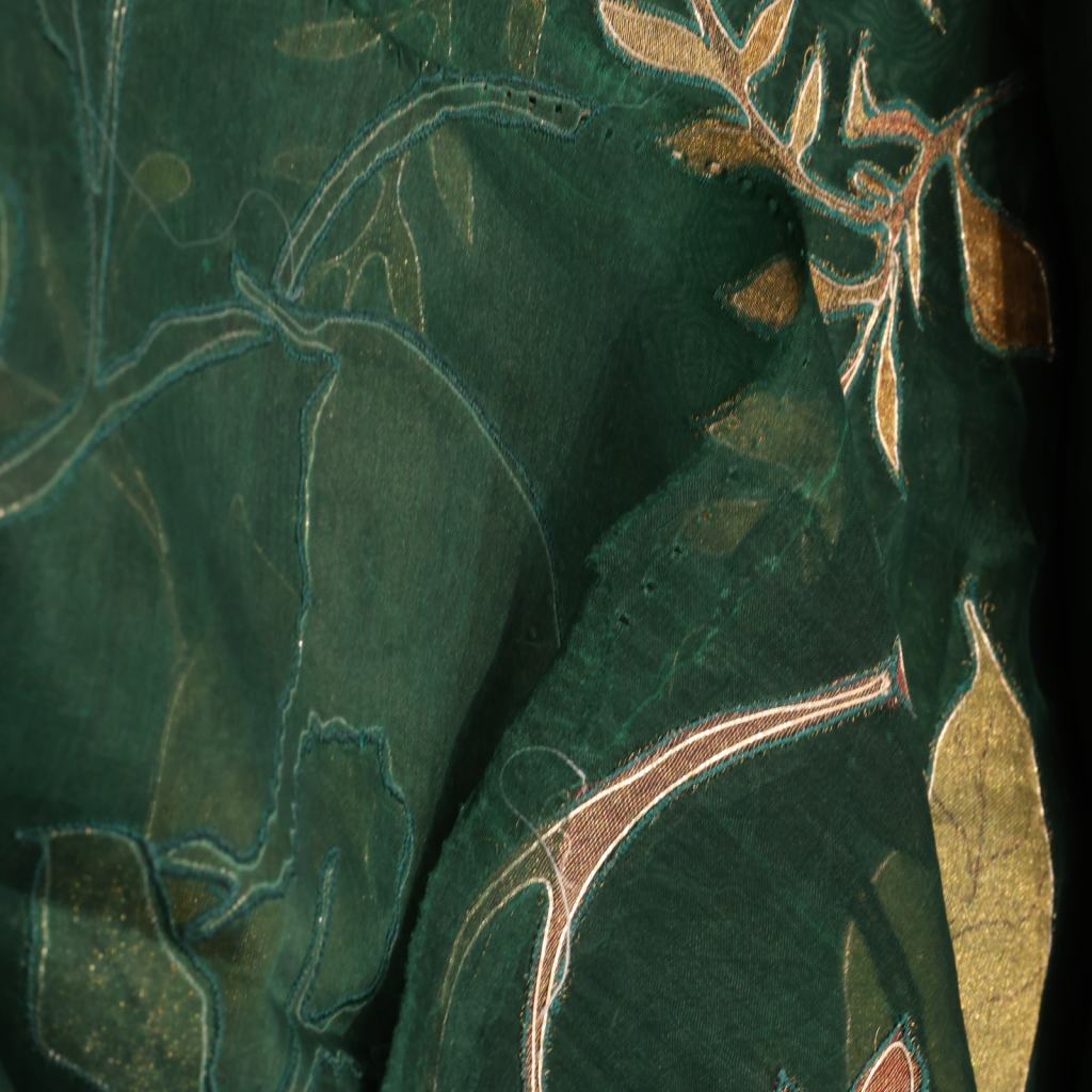 Luxurious organza silk fabric featuring elegant appliqué motifs, beautifully highlighted with a fine golden embroidered outline. Lightweight, sheer, and graceful, it adds a refined festive charm ideal for statement sarees, lehengas, and designer ensembles.