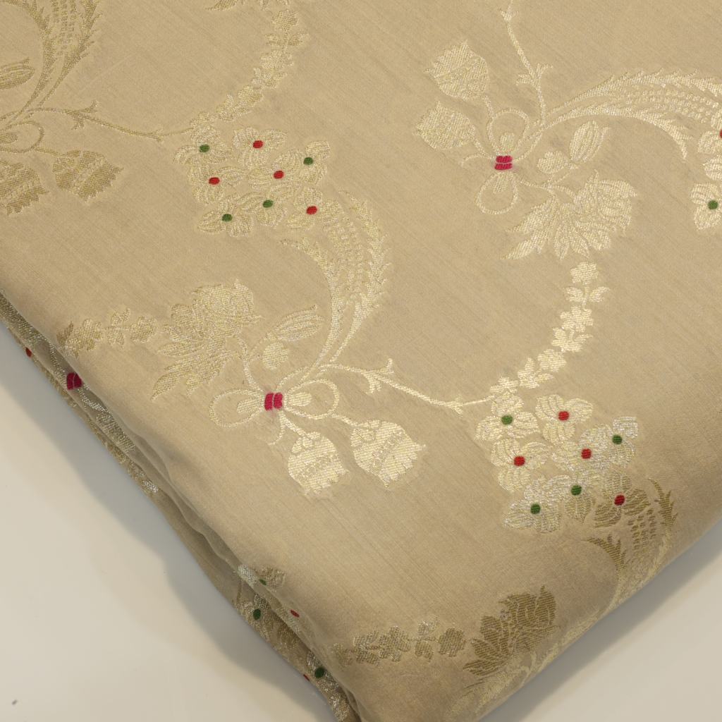 Crafted in pure Munga silk, this fabric is adorned with intricate Banarasi meenakari work, showcasing rich colours and fine detailing. A perfect blend of tradition and luxury, ideal for festive, wedding, and statement ensembles.