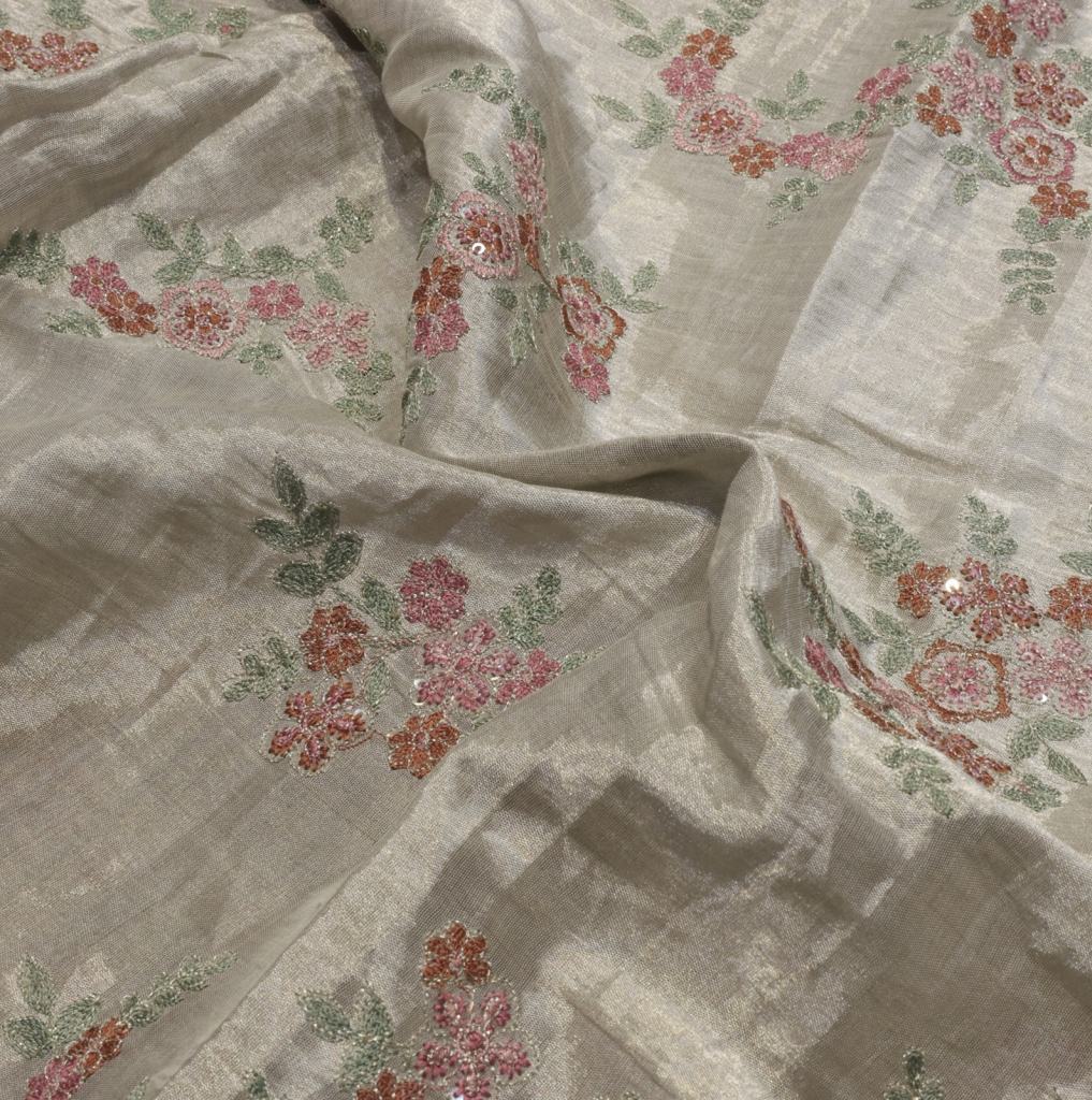 Experience refined elegance with this pure tissue fabric, beautifully adorned with intricate multicoloured embroidery work. Featuring a soft metallic sheen and airy texture, it offers a rich, graceful drape that enhances festive and occasion wear. Perfect for crafting sarees, lehengas, dupattas, and couture ensembles with a vibrant yet sophisticated appeal.