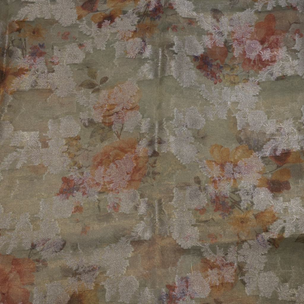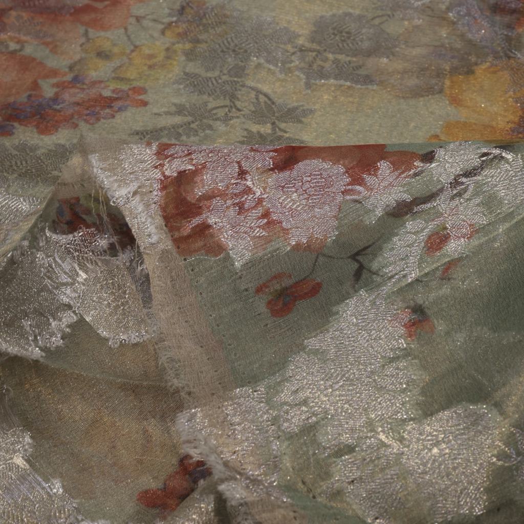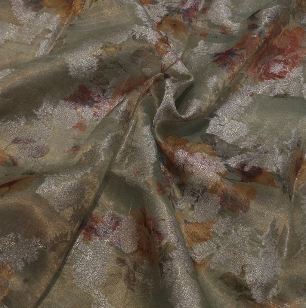 Premium tissue silk fabric featuring vibrant digital prints beautifully complemented by shimmering water gold Banarasi detailing. Lightweight with a subtle sheen, this fabric offers a perfect blend of modern artistry and traditional elegance, ideal for festive and designer wear.